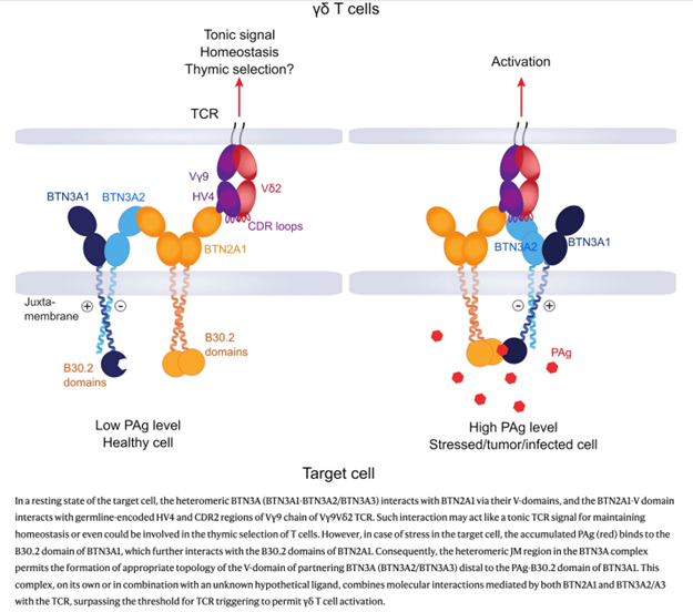 1–5 % der peripheren Blut-T-Zellen sind Vγ9Vδ2 T-Zellen. Sie exprimieren Vγ9Vδ2 TCR und erkennen sogenannte Phosphoantigene (PAg), die phosphorylierte Metaboliten der Isoprenoidsynthese sind. Vγ9Vδ2 T-Zellen greifen Tumorzellen und Körperzellen an, die mit PAg-produzierenden Krankheitserregern infiziert sind, und breiten sich massiv bei Infektionen wie Malaria oder einige bakterielle Infektionen aus. Die PAg binden nicht direkt an den Vγ9Vδ2 TCR, sondern müssen von Zelloberflächenmolekülen "präsentiert" werden. Diese Präsentation erfolgt jedoch nicht durch die Bindung des PAg an die extrazelluläre Domäne der MHC-ähnlichen Zelloberflächenmoleküle, sondern durch Bindung an die intrazelluläre Domäne des Zelloberflächenmoleküls BTN3A1. Nach der Bindung an BTN3A1 bildet ein aktivierender Komplex mit dem strukturell ähnlichen BTN2A1-Molekül LINK und mit nicht-PAg-bindenden BTN3-Molekülen (BTN3A2 und/oder BTN3A3). Dieser Komplex wirkt dann als T-Zell-aktivierender Ligand des Vγ9Vδ2 TCR. Die Vγ9Vδ2 T-Zelle erkennt somit Veränderungen der Zelloberflächenproteine, die durch Metaboliten innerhalb der Zelle induziert werden.